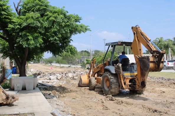 Maquinaria pesada, entre ella una retroexcavadora y camiones de volteo, así como personal de la construcción retiran el material en mal estado, para proceder a preparar la base hidráulica como preparativos para posteriormente aplicar una capa de concreto de por lo menos 20 centímetros de grosor.