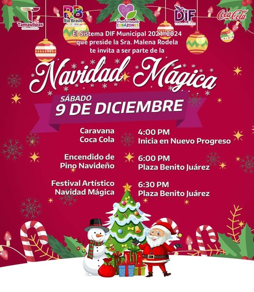 El Sistema DIF Municipal que preside la Sra. Malena Rodela y el Gobierno Municipal de Río Bravo 2021 – 2024 que preside el Lic. Joel Eduardo Yáñez Villegas te invitan a asistir en familia a la gran celebración «Navidad Mágica», que se llevará a cabo este sábado 9 de diciembre, en donde tendremos la tradicional Caravana Coca Cola![]()