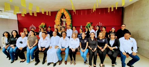 El presidente Escalón, regidores, síndicos, funcionarios y personal de la presidencia, llegaron a la hora marcada, mientras que la presidente del DIF llegó minutos después vistiendo el tradicional traje de catrina y saludando de mano a todos los presentes.