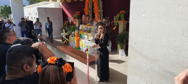 El presidente Escalón, regidores, síndicos, funcionarios y personal de la presidencia, llegaron a la hora marcada, mientras que la presidente del DIF llegó minutos después vistiendo el tradicional traje de catrina y saludando de mano a todos los presentes.